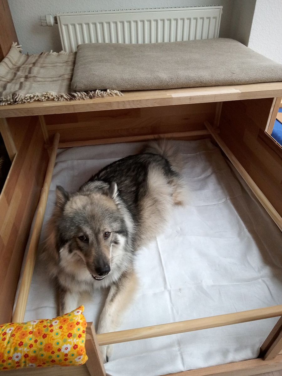 Endlich kam der Ultraschall-Termin. Es waren fünf schlagende Herzen zu sehen. Die Vorfreude wuchs. Wir begannen mit den Vorbereitungen und bauten fleißig an der Wurfbox. Die freundlichen Nachbarn brachten ihre ausgemusterte Bettwäsche vorbei. Ilvi wurde immer birnenförmiger, spazieren gehen, rennen und spielen fiel ihr zunehmend schwerer.