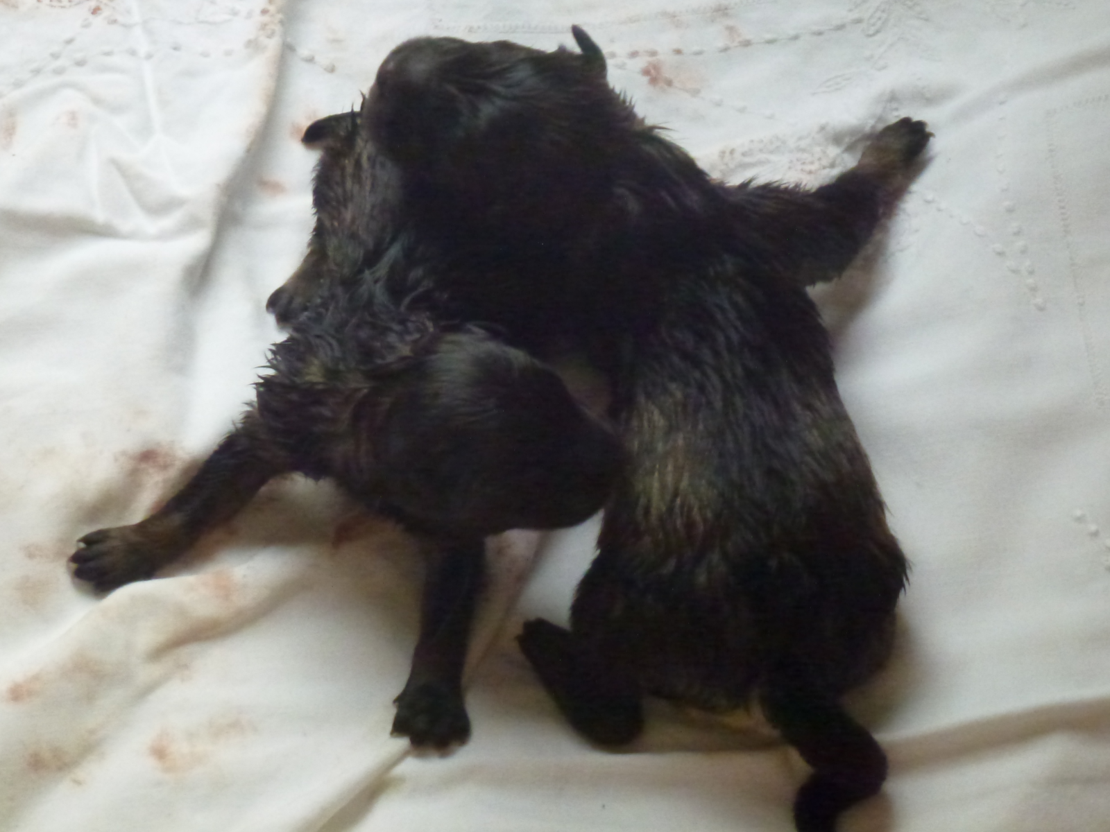 Jetzt wurde das Ganze dramatischer, als uns allen lieb war. Der vierte Welpe hatte eine Schädelmisbildung und war leider nicht lebensfähig. Dieser arme kleine Kerl versperrte den Weg für die beiden Welpen, die noch warteten, geboren zu werden. So musste am Abend ein Kaiserschnitt gemacht werden.