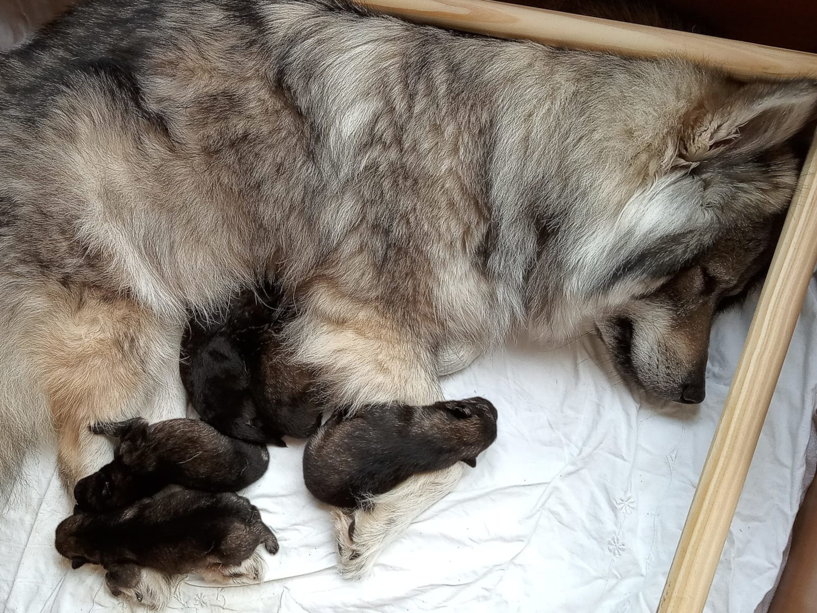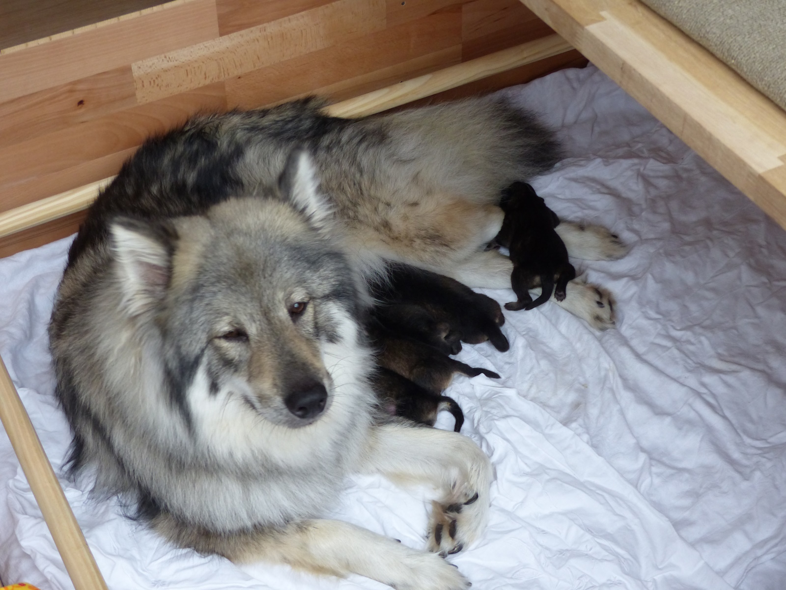 Am 24. März 2026 war es dann soweit. Zur Mittagszeit erblickten die ersten beiden Welpen des A-Wurfs das Licht der Welt, zwei kleine Mädchen. Ilvi machte sich hervorragend als Mutter. Instinktsicher nabelte sie die Babys ab, versorgte und säugte sie. Meike kam gerade aus der Schule und konnte erleben, wie auch der dritte Welpe geboren wurde, ein kleiner Junge.