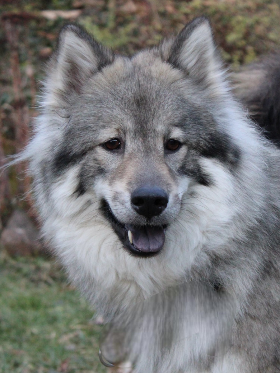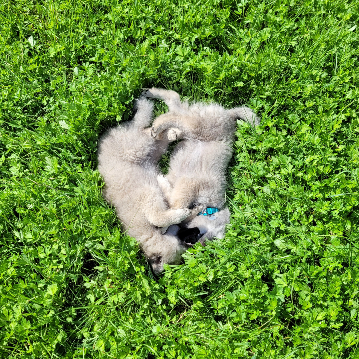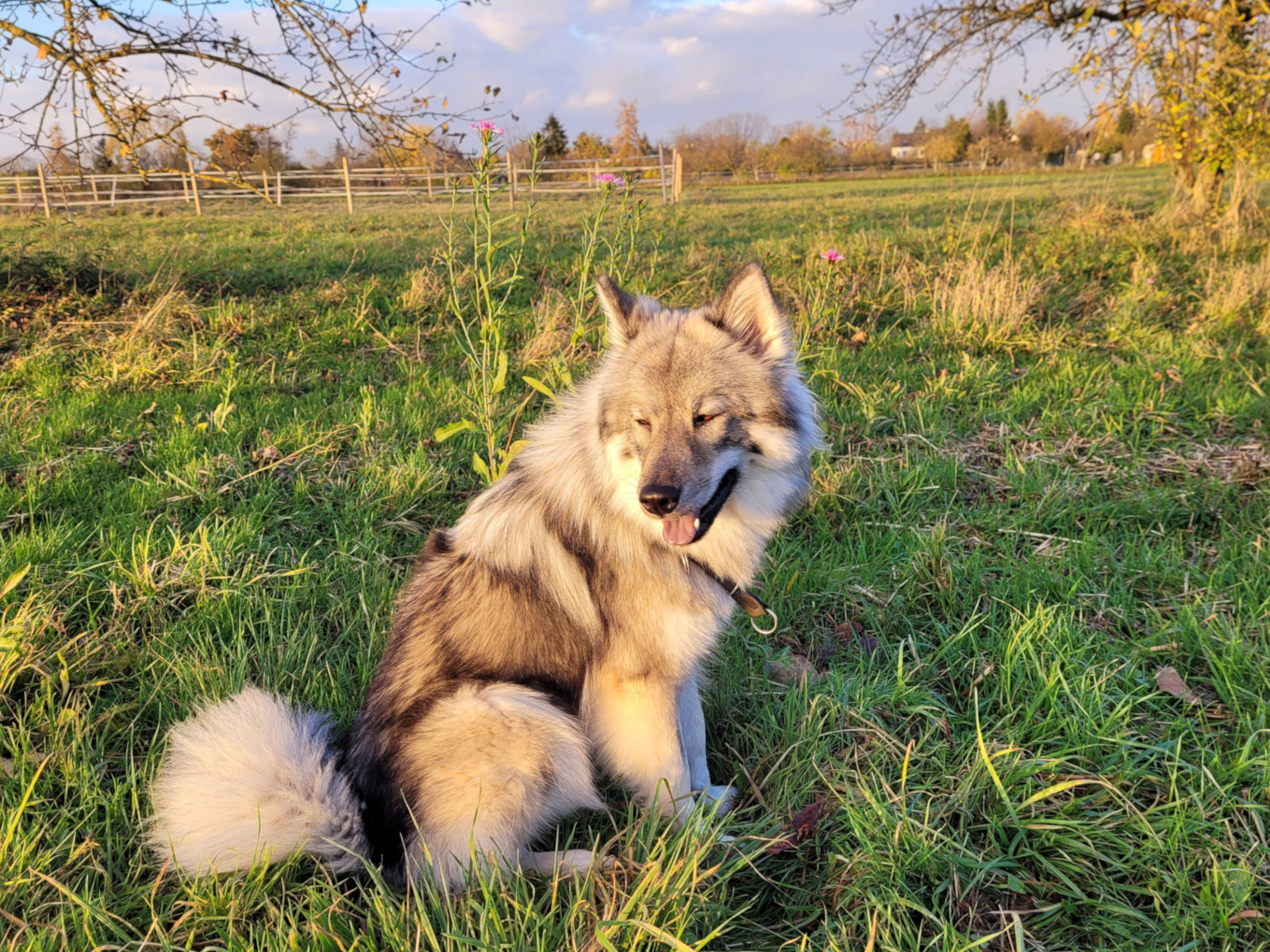 Ich bin am 29.04.2022 geboren und neun Wochen später bei meiner Familie eingezogen. Am Anfang sahen meine acht Geschwister und ich uns sehr ähnlich, aber heute sind die meisten von ihnen falbenfarben wie unsere Mama und unser Papa. Ich hingegen sehe fast aus wie meine Urahnen, die Wölfe. Zum Glück habe ich meine nach oben gebogene Rute, so verwechselt man mich nicht.